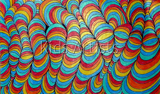 After a dance project, students of our school made these break dancers, listening to their iPods while dancing. Use pencil and ruler to divide the sheet lenghtwise in five compartments. Draw two meandering lines from top to bottom. The sheet is divided in 15 compartments now. Use a compass to draw circles of different sizes at the intersections of the lines. Colour all compartments alternately using two colours. Work top to bottom , to avoid mistakes.
