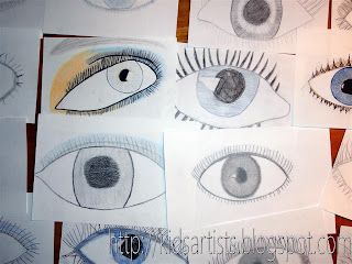 Kids drawing one eye and colour it in with colour pencil. Wipe the colors with your fingers to mix them. Accents can be applied with a black fineliner.