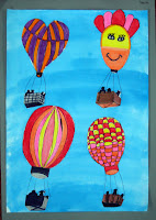 Students paint their white sheet light blue with watercolour paint, using lots of water. When the sheets are drying, balloons have to be drawn and coloured on another sheet: a big one, a midsize and one or two small ones. After this students have to draw some baskets, with silhouettes of people (use a black fineliner!). Cut the balloons and the baskets.