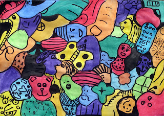 Paint organic shapes on you sheet with different colours. Make sure the whole sheet is full. After drying, take a black fineliner or marker and search for faces, animals or objects in your shapes. Outline them and add details to recognize your object or face!