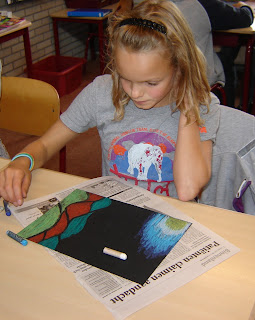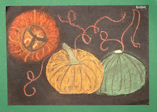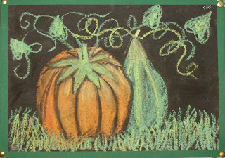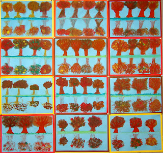 Ask students a week before this lesson to take some flat dried leaves. Every student chooses one of his own leaves and outlines it several times with a pencil. Remember to draw not all the leaves in the same way on the paper, because they whirl down from the tree. Make sure some leaves go over the edge; those leaves will later be finished on the background.