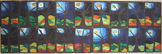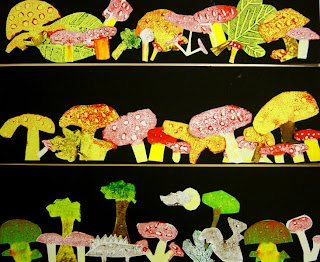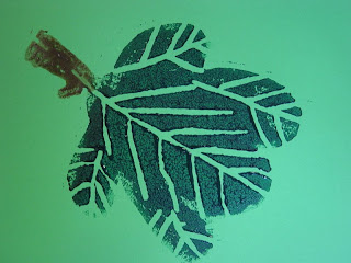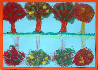 Leave the work to dry and paste in on a coloured background. Outline the leaves with a thick black marker. Use a fine black marker for drawing the veins, while observing carefully the real leaves. Don't stop with outlining and drawing veins when you reach the background, but go on with it there.