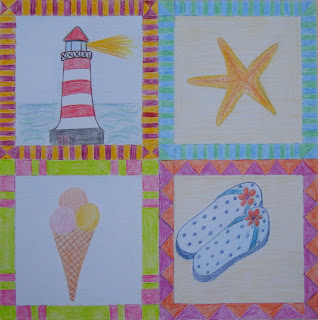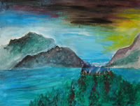 Fold the paper in half. Above the fold is the country, below the fold is the water. Students draw with oilpastels some trees without leaves in the grass. Those trees have to be coloured firmly. Below the fold is the reflection of the trees in the water. The trees have to be drawn again, but mucht less thick coloured.