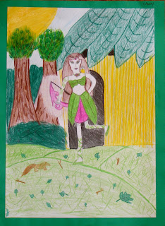 When the trees are ready, students get a plate with five colours of tempera: yellow, orange, red, brown and green. leaves have to be made by tamponning with the brushes. Tell your students to tampon with two or more colours at the same time, so don't mix up the colours.