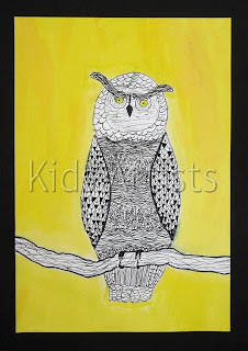 Children sketch an owl on a branch with pencil, considering the characteristics from owls we talked about before. After this, patterns have to be made in the body parts of the owl, with different sizes of black markers. By making different patterns, those body parts must be recognized. Only the eyes and the beak may be coloured yellow or orange, the rest is black or white.