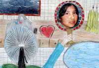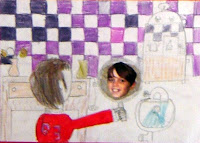All children get two printed photographs of themselves: one with the back of the head/shoulders/stretched hand with handmirror, and one photograph of their face. The 'back'photo has to be used to copy. Draw yourself at the left of the sheet. Copy the stretched hand as well as you can. After this they draw the background: the bathroom or maybe the bedroom. The hand mirror has to be drawn bigger, because the photograph has to fit!