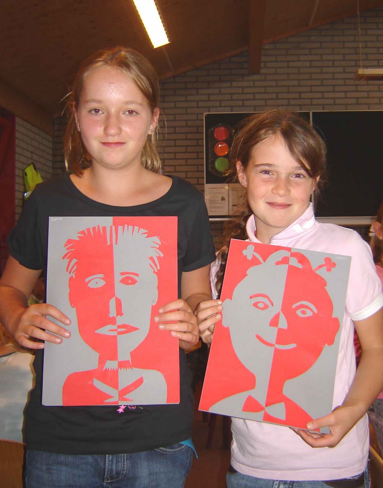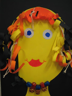 Each student gets two coloured sheets of paper; one for the background and one for the face. Fold the sheet for the face lengthwise and draw half a face against the fold. Don't forget the ears! Cut the face and glue it on a background, letting a bit space between face and background. uit en plak het op de achtergrond met een beetje ruimte eronder. So don't glue it flatly. Cut eyes, nose and mouth out of leftover paper and glue them on the face. Decorate the face with different materials. Thing of earrings, glasses, hair, make-up, chain, necktie etc.