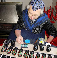 Staphorst is a a town in the eastern Netherlands. The town is famous for about 600 women who are still wearing traditional dress. Until now, utensils and cloths are designed with characteristic 'Staphorster Stipwerk', translated: Staphorst polka dots. Staphorster stipwerk is made by nails stuck in corks and then tipped in paint. The stipwerk is mostly done on a dark surface.