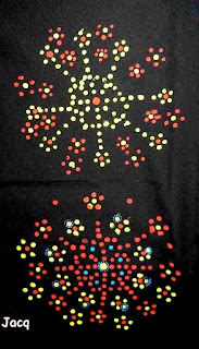 Show some examples of Staphorster Stipwerk (Google image searcher). Discuss what you see: colour use, size of the dots, motives, patterns etc. Let children practice first in making patterns. Use a scratch paper and colour pencils for this. If they understand the principle of making flowers out of polka dots, they can start stamping with the nails. This lesson can be done individually, but making a group table cloth is maybe much more fun! And: in stead of stamping on cotton, it is also possible to stamp on wooden utensils, like a small chipboard box or a wooden plate. Before stamping, the box has to be painted black of course. And, don't use textile paint but use tempera. Lacquer with vernish for shiny result.